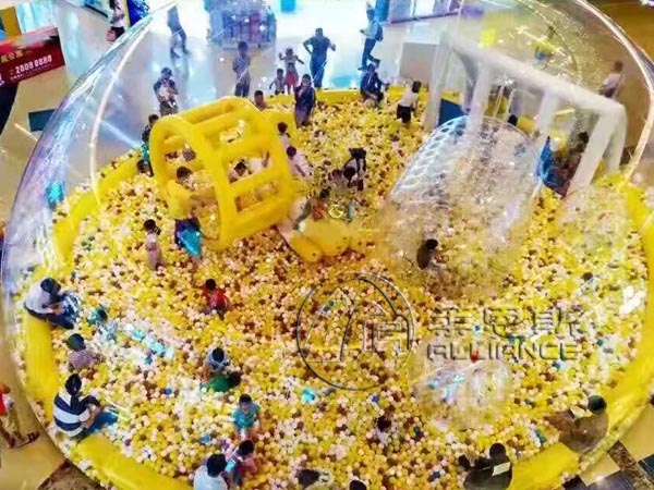 兒童水晶宮海洋球樂(lè)園設(shè)計(jì)合理美觀?,F(xiàn)有直徑12m,高度5m的規(guī)格,充氣海洋球池胎高0.5m,可容納千萬(wàn)顆各種顏色的海洋球,更多尺寸可以根據(jù)客戶需要定制設(shè)計(jì)生產(chǎn)。海洋球池顏色和規(guī)格大小可根據(jù)客戶需要自己選擇。海洋球是由軟體TPU材質(zhì)熱合而成,球池及內(nèi)置充氣門框由夾網(wǎng)PVC材質(zhì)熱合而成,具有耐高溫,耐磨損特性、兒童水晶宮海洋球池樂(lè)園采用的是特定款新風(fēng)機(jī),在很好的保證“宮殿”被吹起來(lái)的同時(shí),內(nèi)部空氣也是新風(fēng)系統(tǒng)。水晶宮內(nèi)外壓力差值較小,讓孩子們?cè)诶锩嫱嫠r(shí)不會(huì)有不適感。