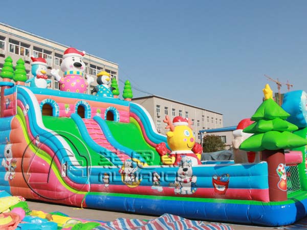 產(chǎn)品介紹 產(chǎn)品名稱:圣誕熊充氣滑梯產(chǎn)品規(guī)格:15x8m(長*寬)產(chǎn)品材料:0.480.02mm環(huán)保夾網(wǎng)PVC配置:風(fēng)機(jī)、布料、膠水供氣方式:風(fēng)機(jī)連續(xù)供氣使用壽命:12-14萬人次 保修期:產(chǎn)品出售后